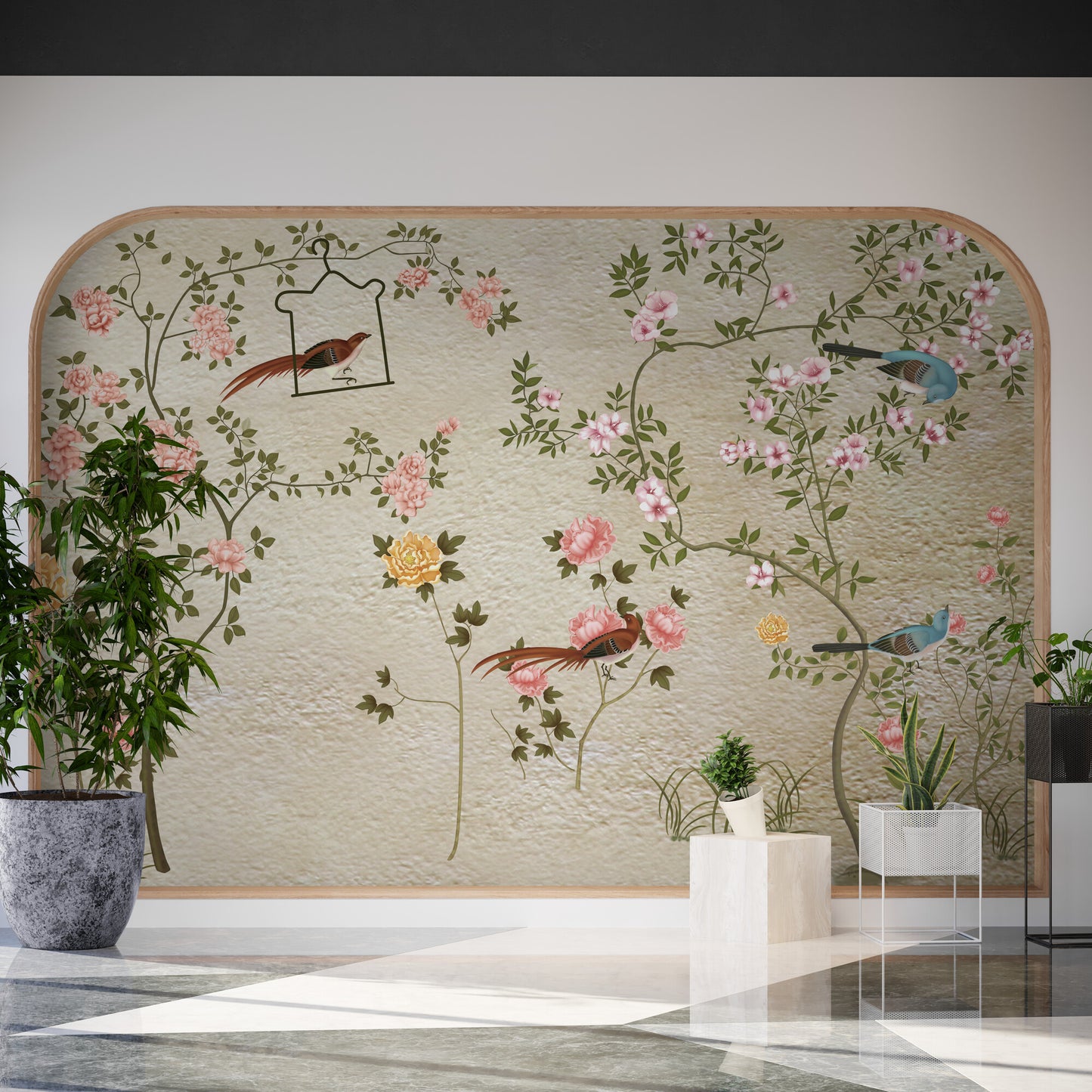 Wandbild mit Vögeln und Bäumen, botanische Japandi-Tapete, selbstklebendes Wandbild mit Sakura-Blüten, florales orientalisches Wandbild, Chinoiserie-Tapete, abziehbare und aufklebbare Tapetenwand fürs Schlafzimmer