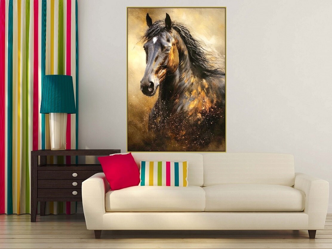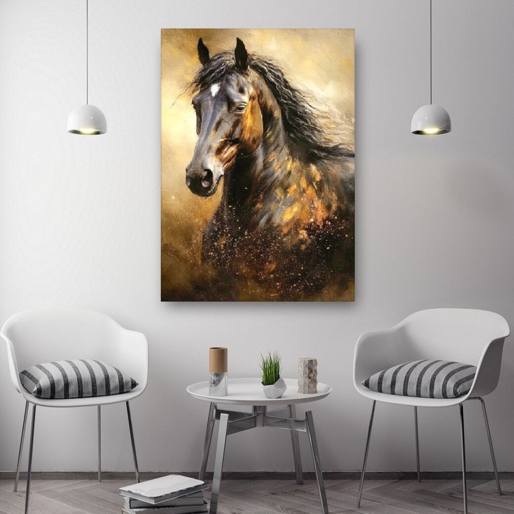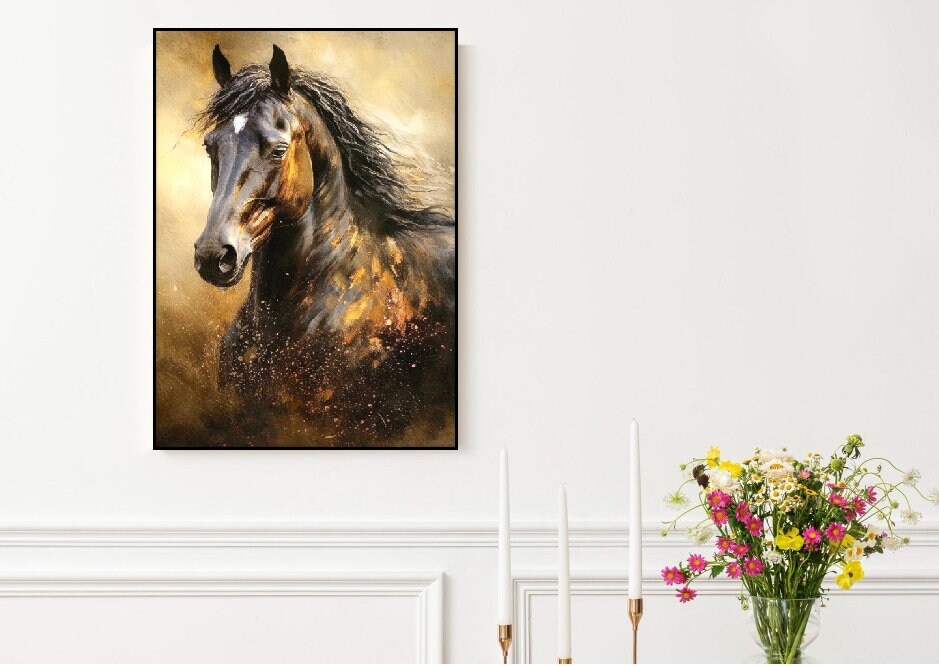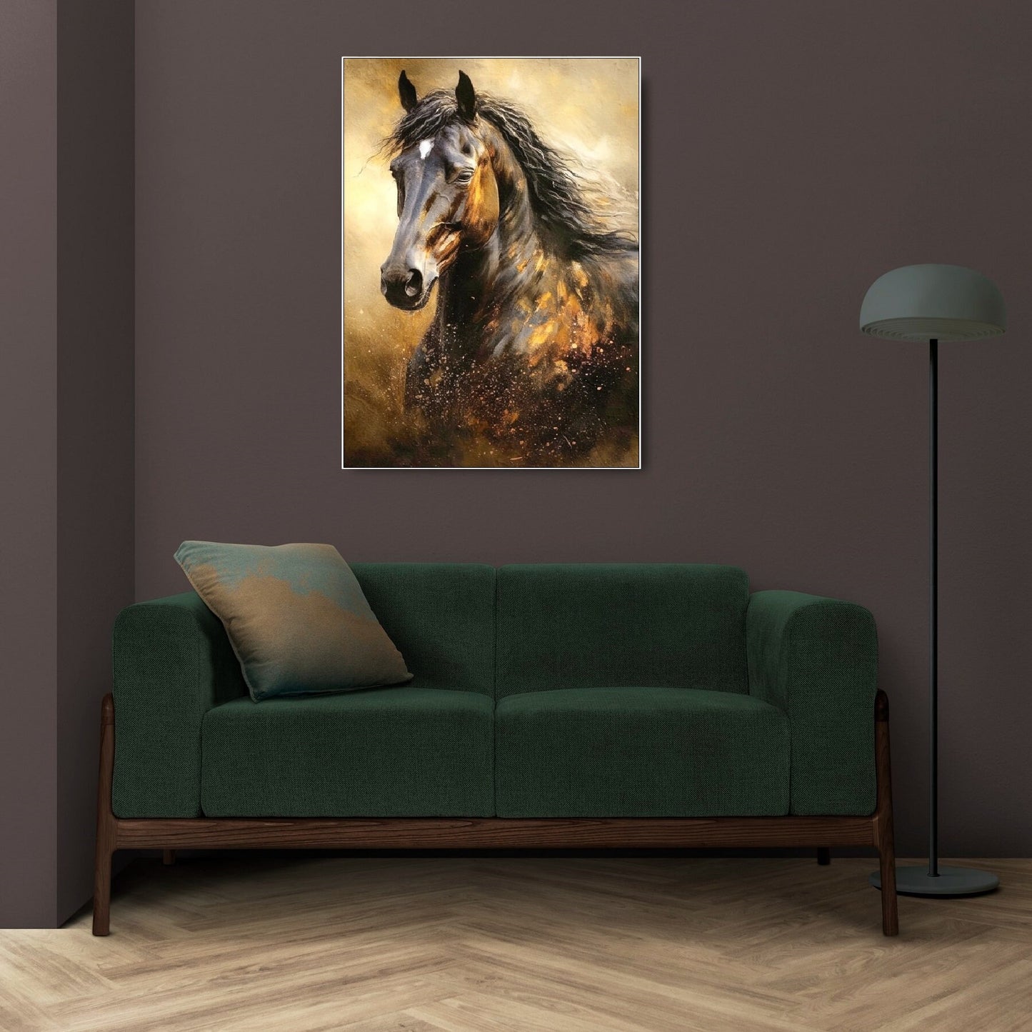 Schwarzes Pferdebild im Floater-Rahmen, großer Leinwanddruck mit Tieren, gerahmte dunkle Wanddekoration, braun-schwarze Wandkunst fürs Wohnzimmer