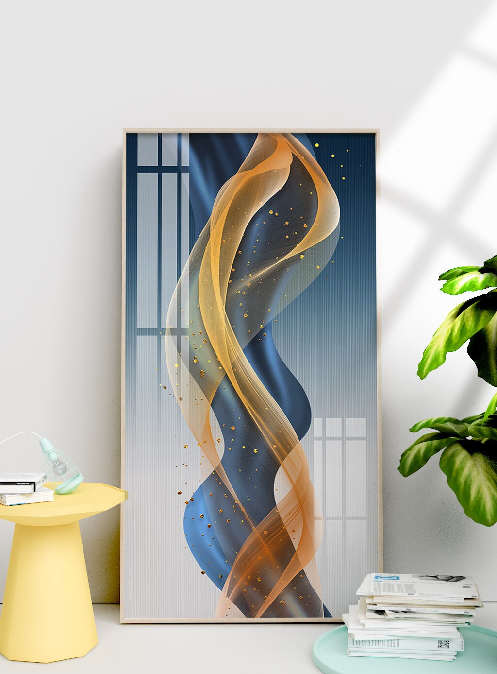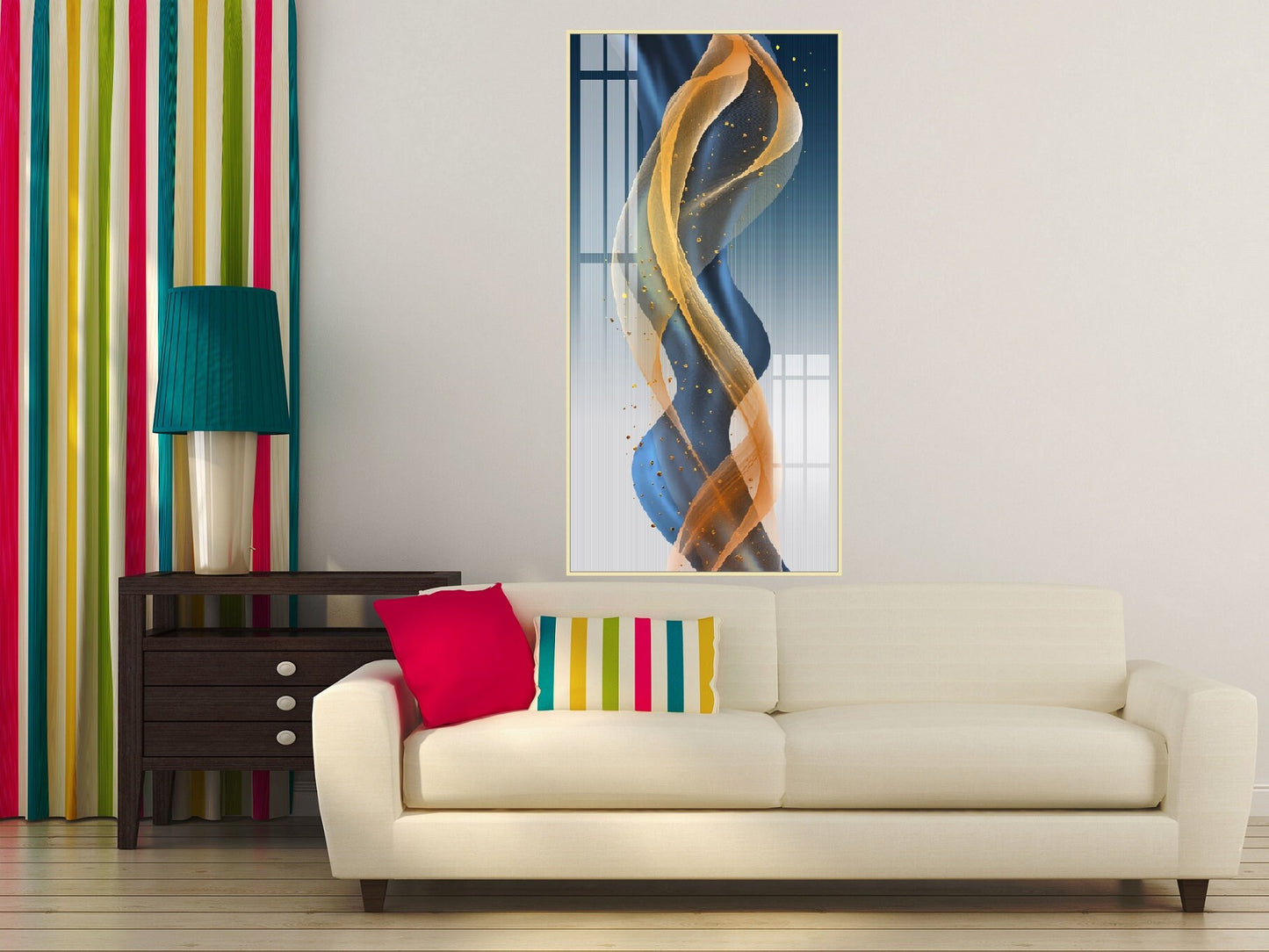 Blaue abstrakte gerahmte Wandkunst, blau-goldener Wellen-Leinwanddruck im Floater-Rahmen, extra großes goldenes Wanddekor, Wohnzimmer-Wandkunst