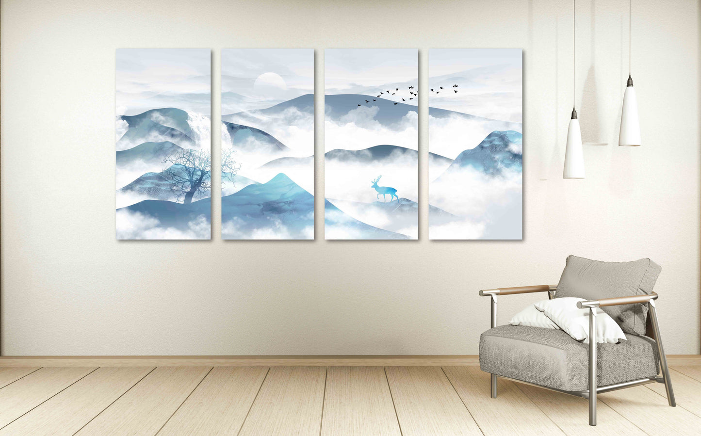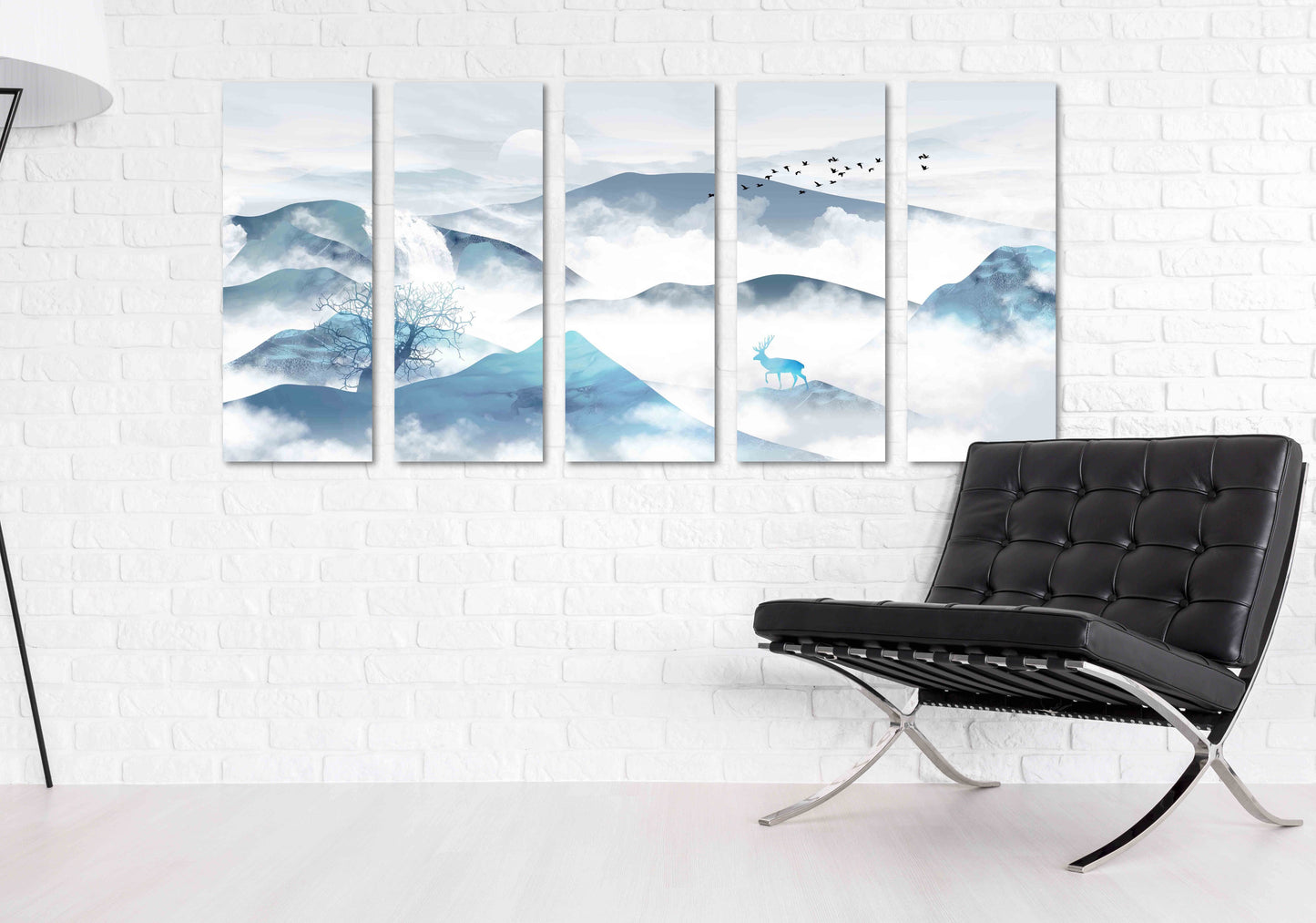 •Die Größe eines Gemäldesets, das aus mehreren Tafeln besteht, wird berechnet, indem die Tafeln zusammengezählt werden. Es wird empfohlen, solche Sets mit einem Abstand von 1–2 Zoll zwischen den Tafeln an der Wand anzubringen. Je größer die Bildelemente, desto größer ist der zulässige Abstand zwischen ihnen.