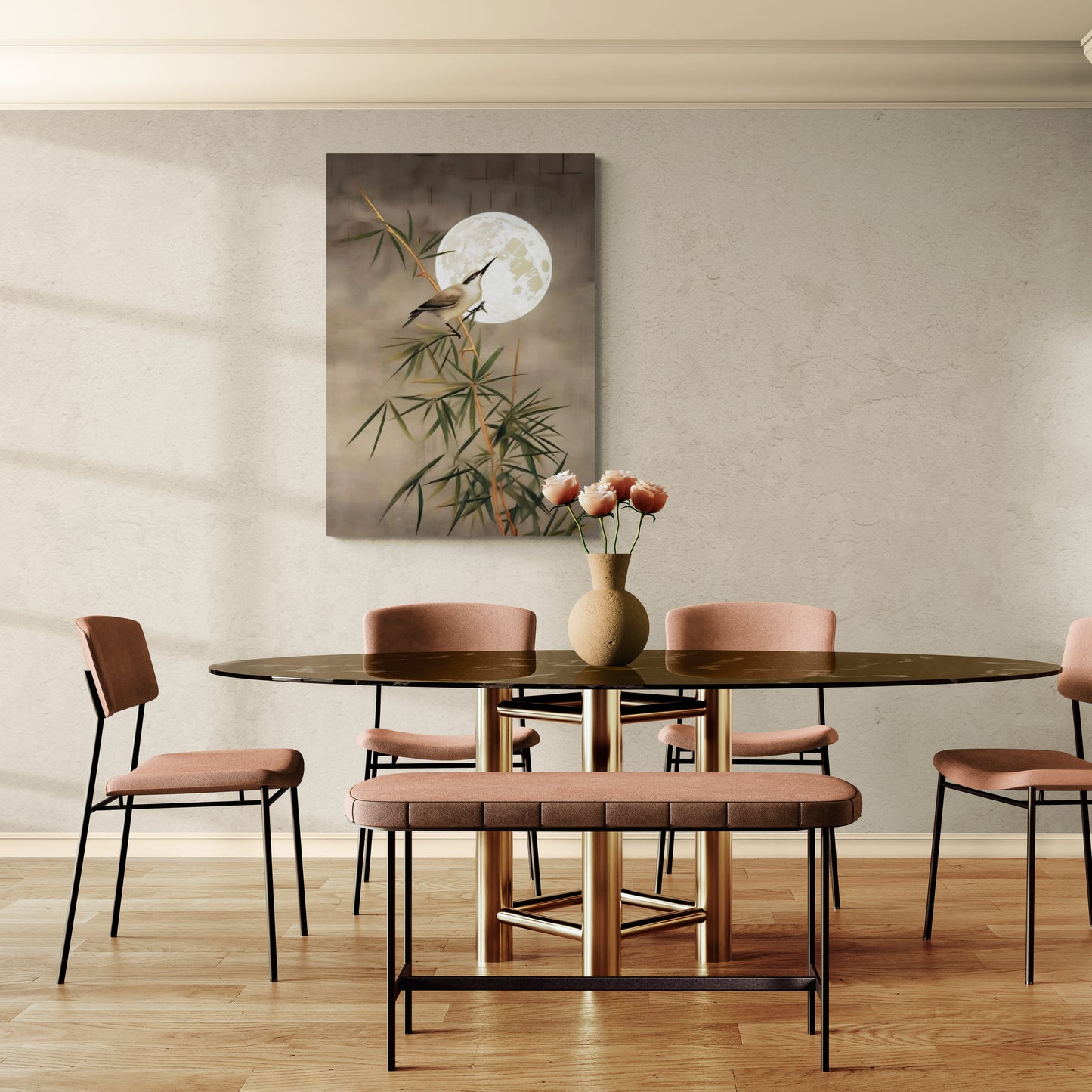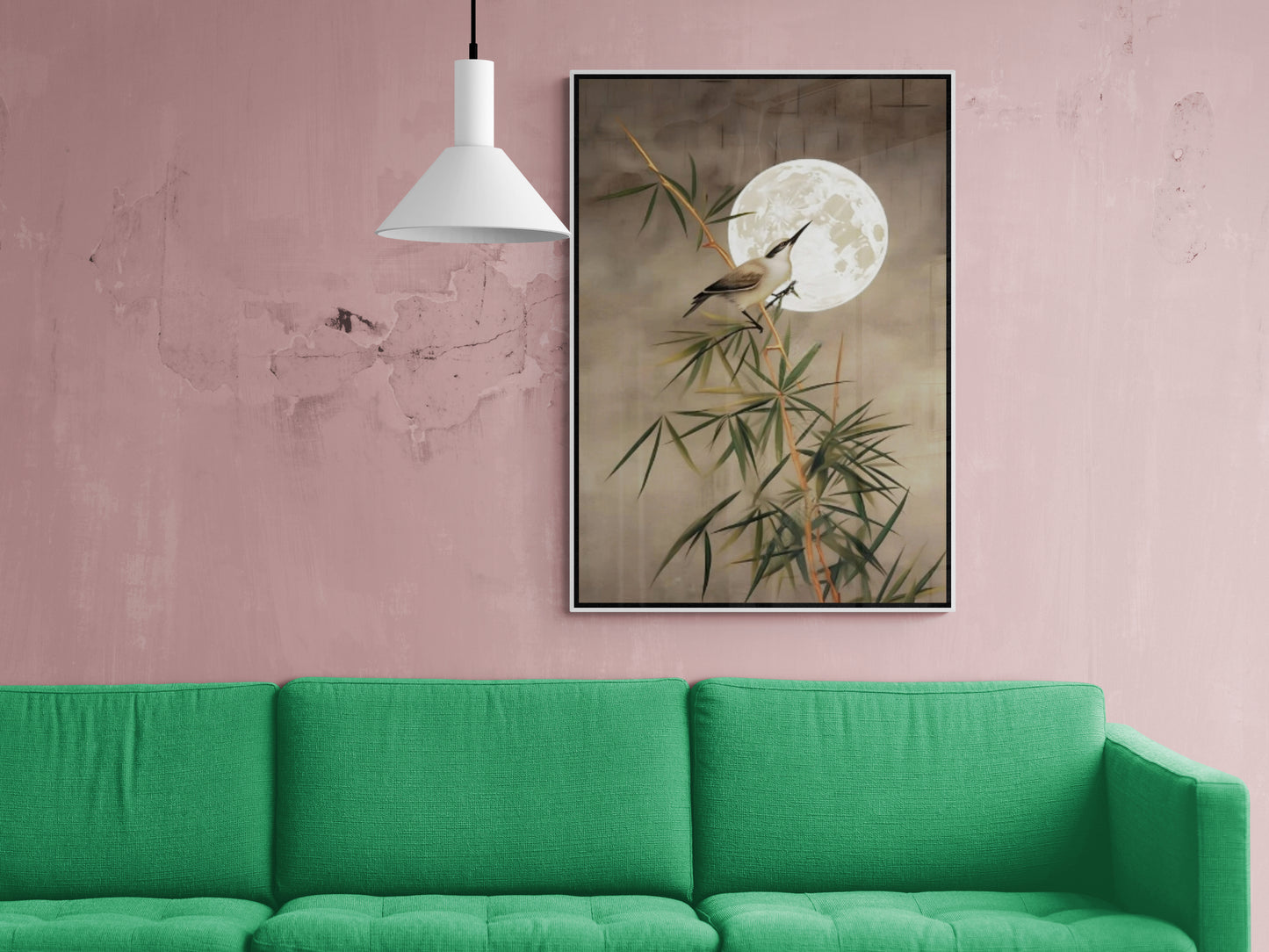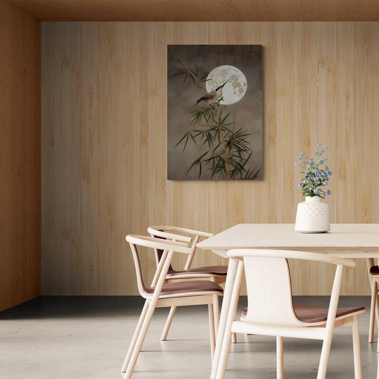 Wandkunst mit Pflanzen und Vögeln, botanischer Leinwanddruck, orientalische Wandkunst, Chinoiserie-Kunstwerk fürs Wohnzimmer, Wandkunst mit Mondbild, Wandkunst als Geschenk