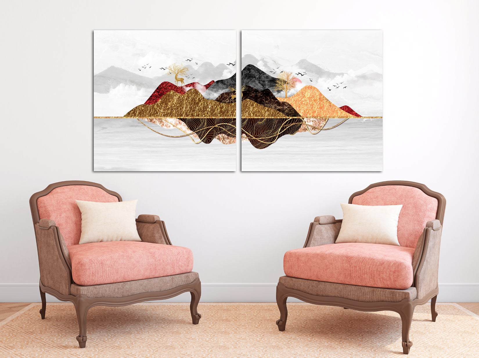 • Die Größe eines Gemäldesets, das aus mehreren Tafeln besteht, wird berechnet, indem die Tafeln zusammengezählt werden. Es wird empfohlen, solche Sets mit einem Abstand von 1–2 Zoll zwischen den Tafeln an die Wand zu hängen. Je größer die Bildelemente sind, desto größer ist der zulässige Abstand zwischen ihnen.