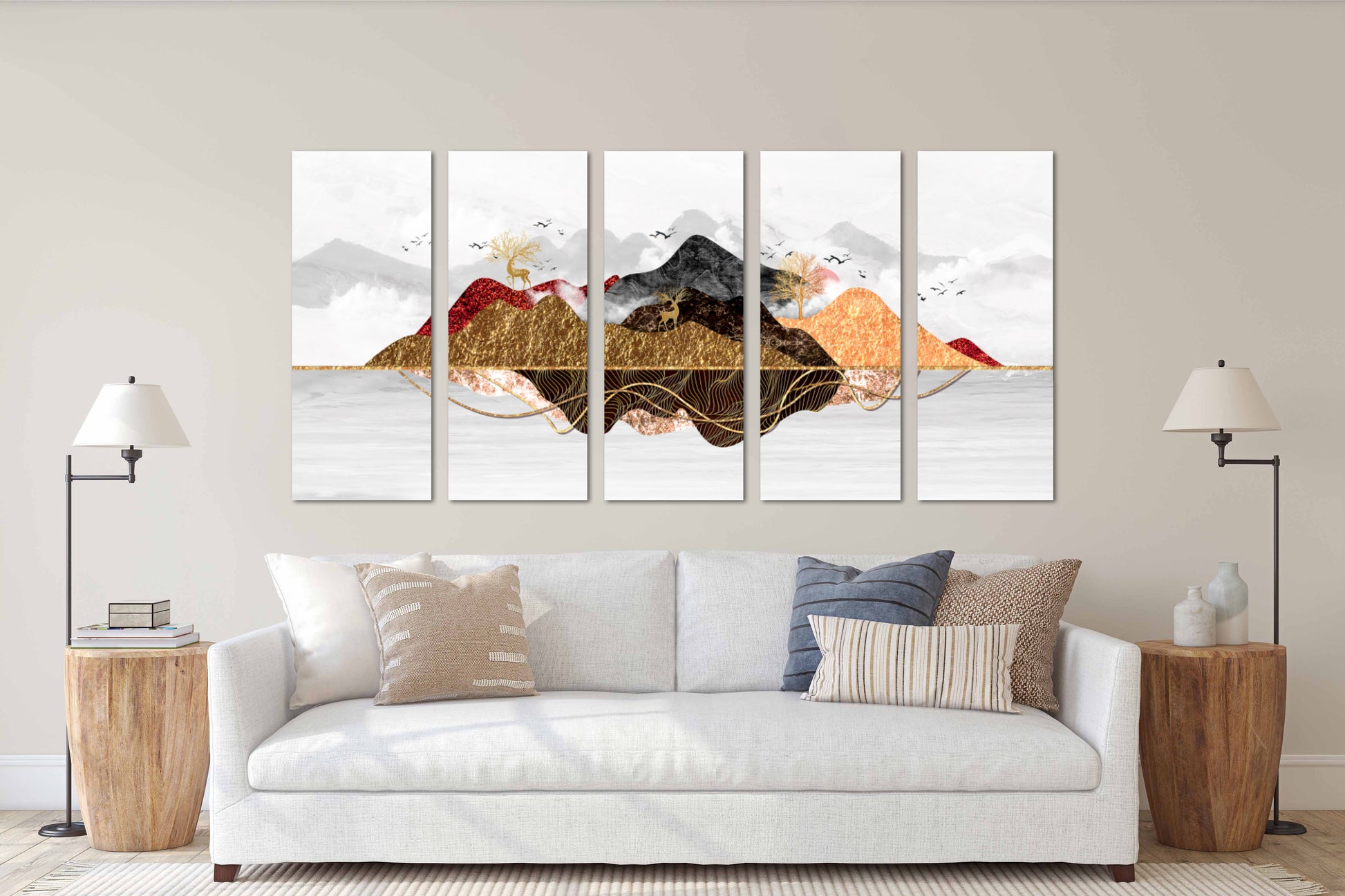 Gerahmte Wandkunst Berge Goldener Hirsch Rauchberge Wandkunst 3-teilige Leinwand Outdoor Berge Leinwandgemälde Home Wanddekoration
