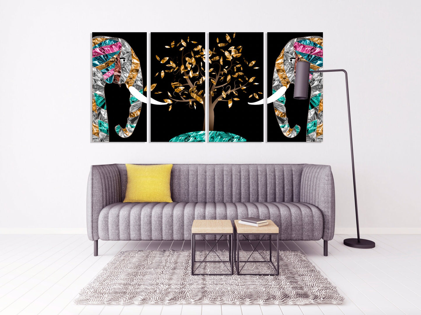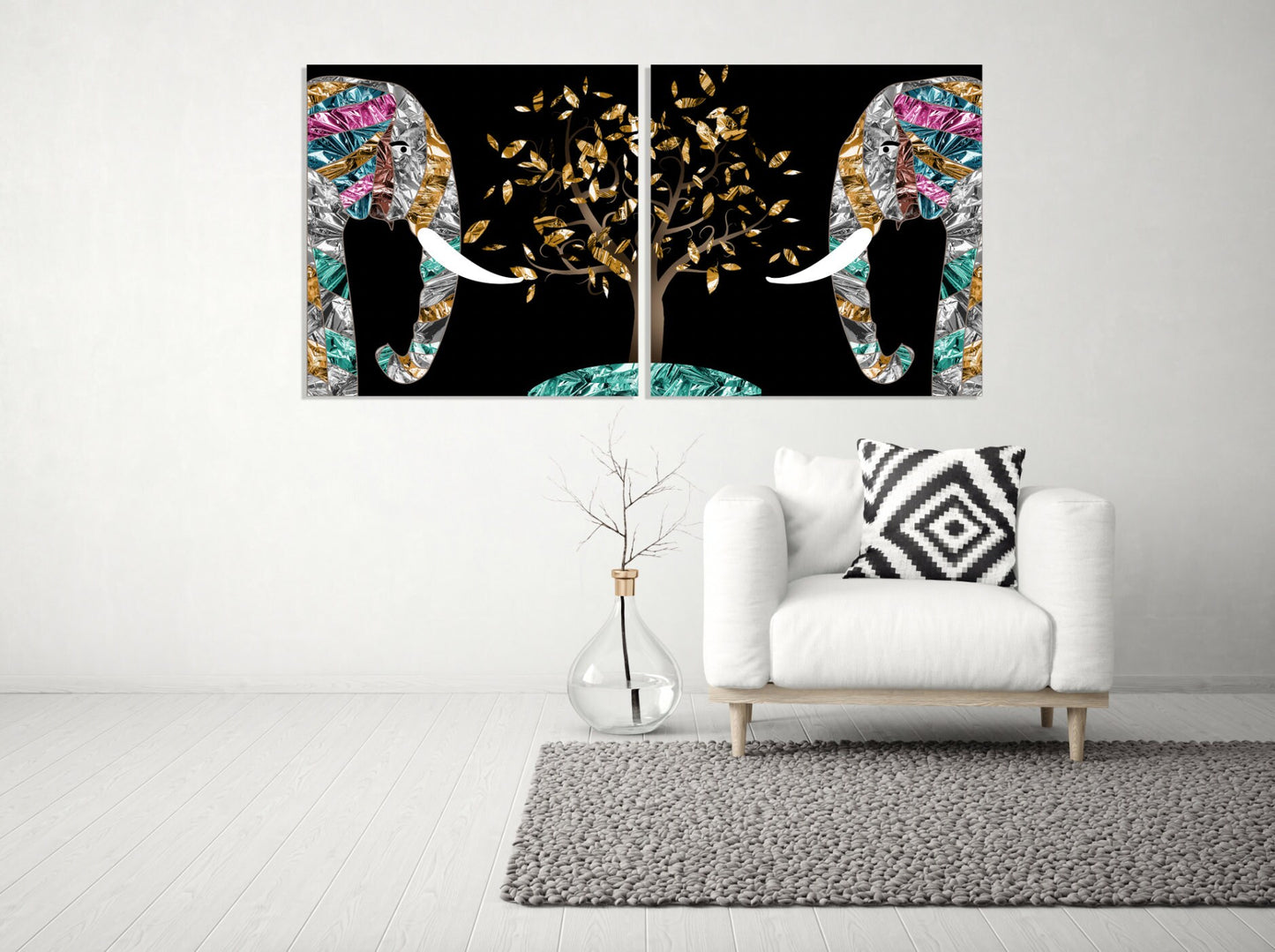 • Die Größe eines Gemäldesets, das aus mehreren Tafeln besteht, wird berechnet, indem die Tafeln zusammengezählt werden. Es wird empfohlen, solche Sets mit einem Abstand von 1–2 Zoll zwischen den Tafeln an die Wand zu hängen. Je größer die Bildelemente sind, desto größer ist der zulässige Abstand zwischen ihnen.