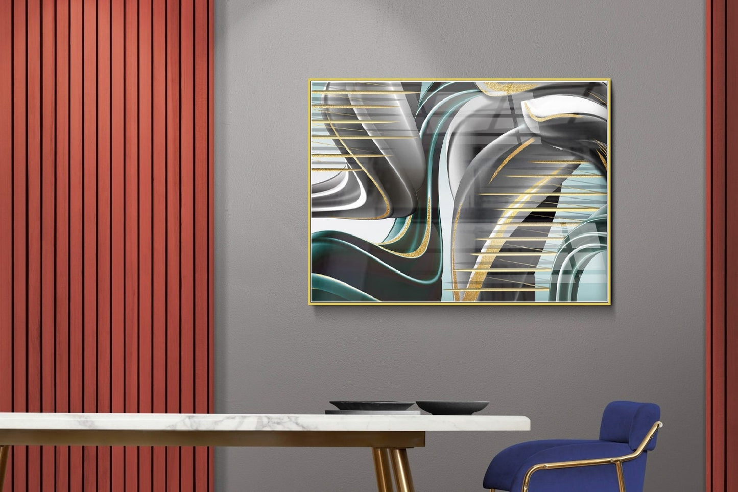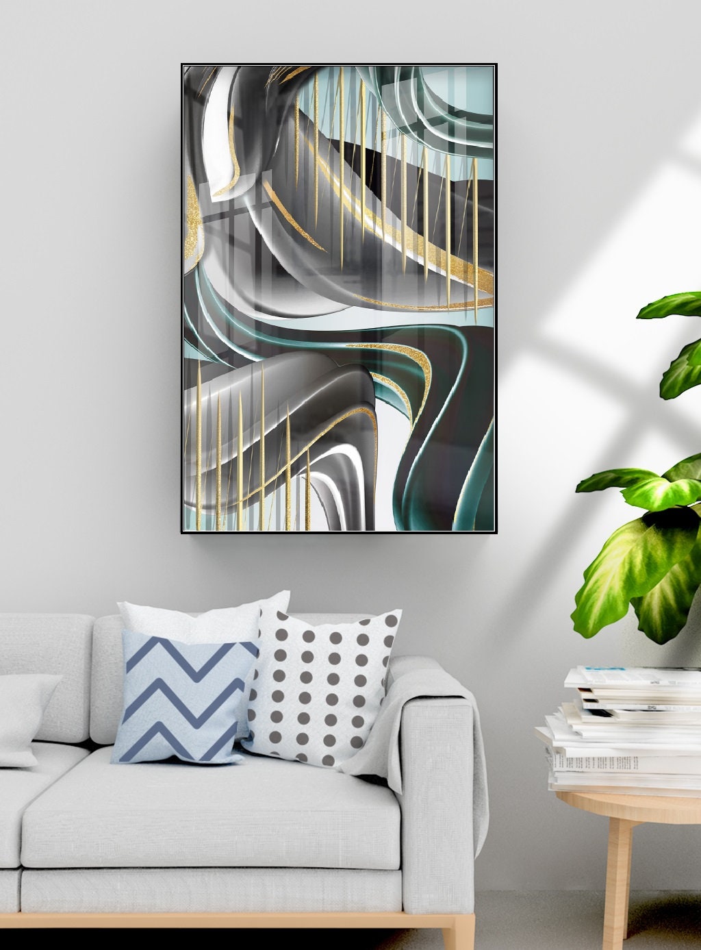 Großes abstraktes gerahmtes Wandbild, schwarz-goldener Leinwanddruck, druckbares Kunstwerk im Floater-Rahmen mit Wellen und Streifen, Wandbild fürs Wohnzimmer