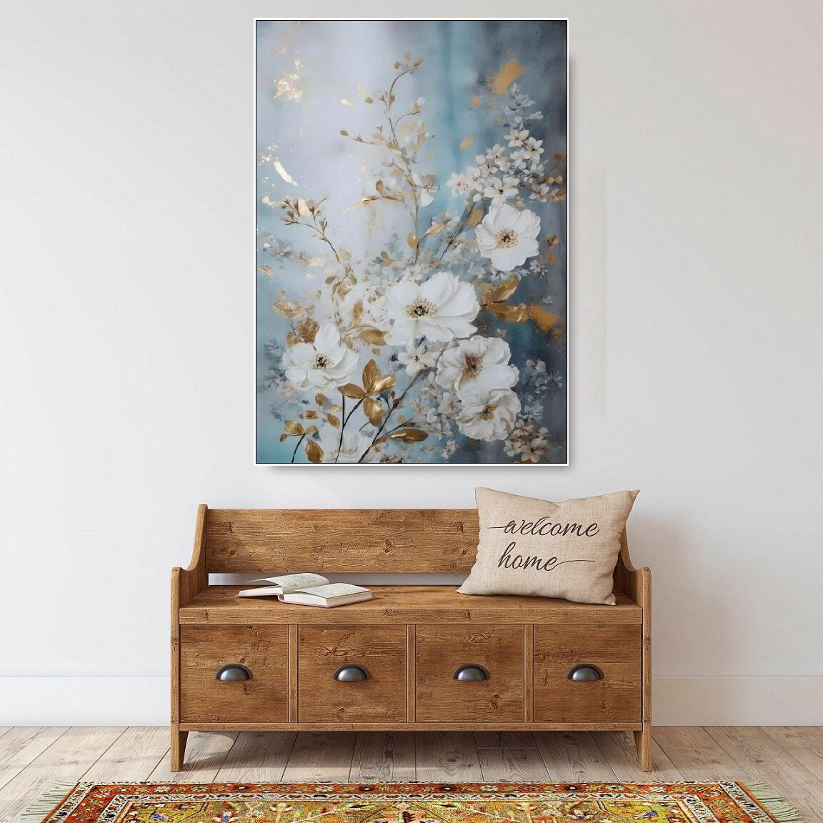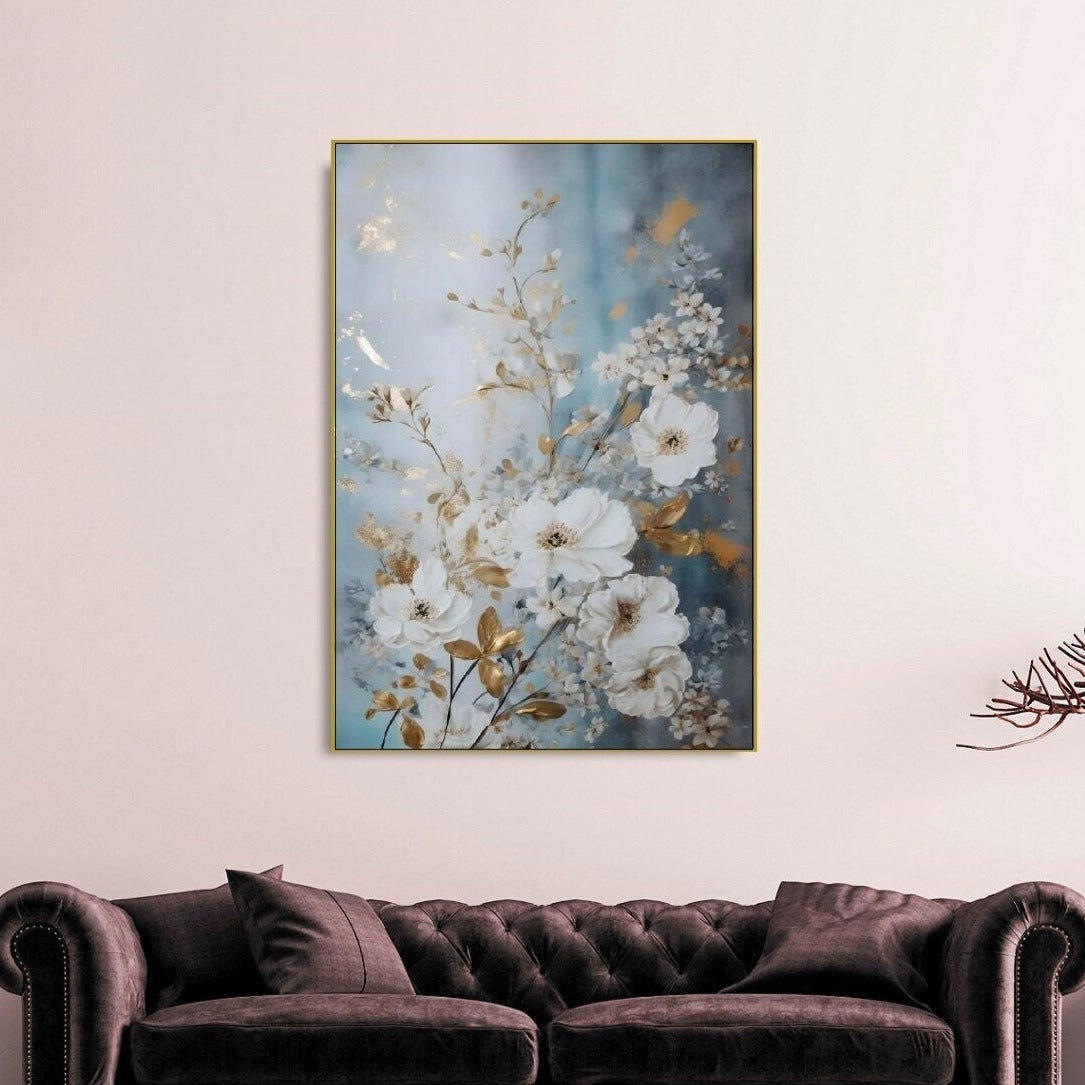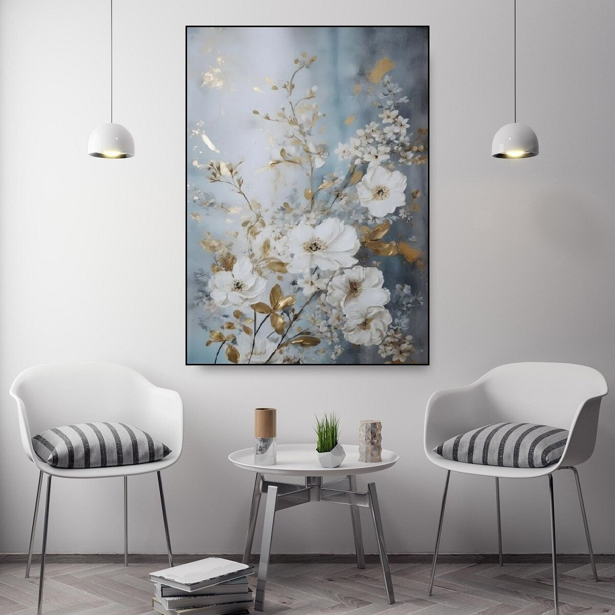 Großes florales Aquarell-Wandbild, Wildblumen-Kunstwerk im schwebenden Rahmen, weißer Blumen-Leinwanddruck, blau-weißes Schlafzimmer-gerahmtes Wandbild