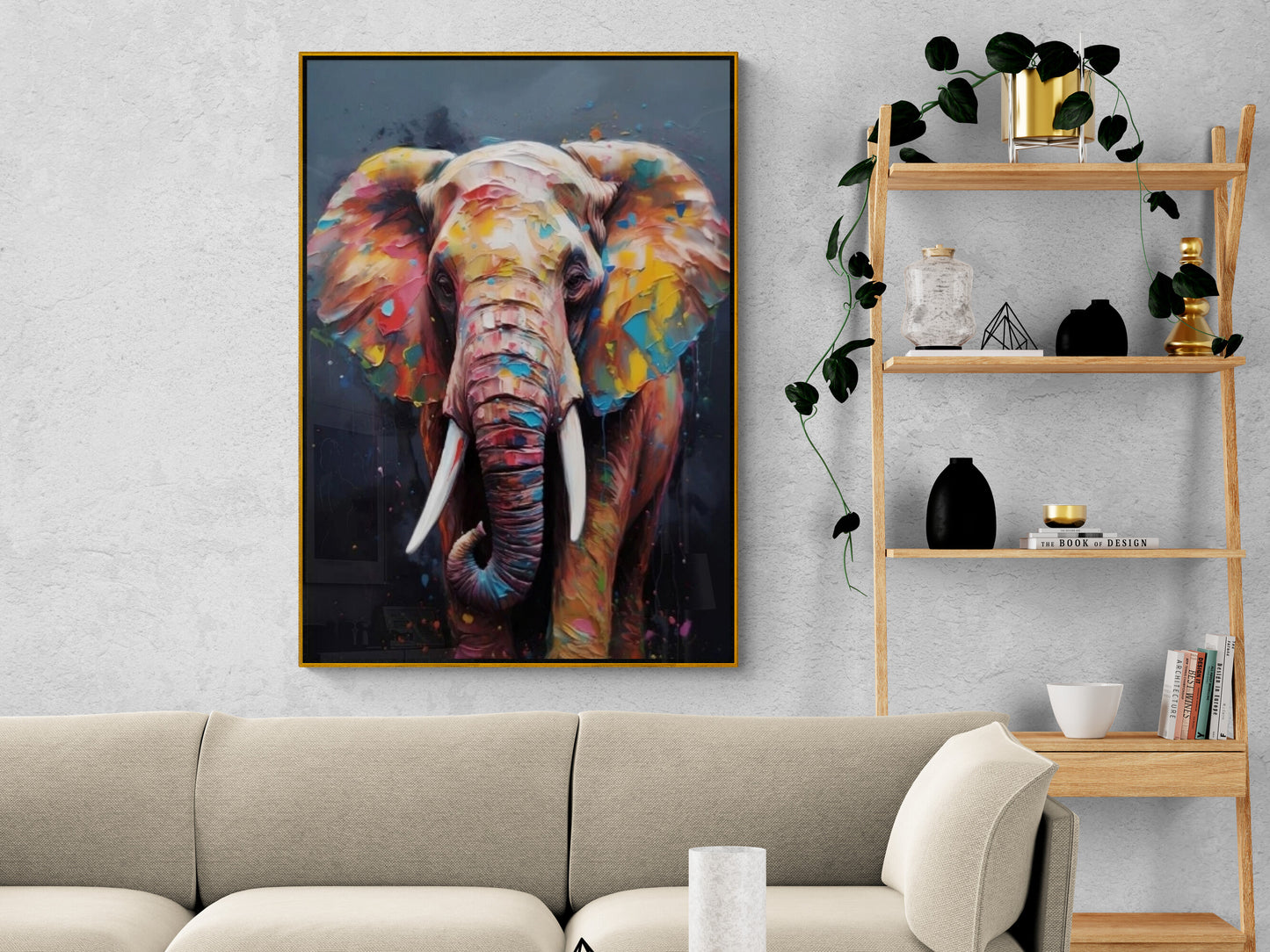 Farbenfrohe Elefanten-Wandkunst, großer Tier-Leinwanddruck, druckbares Kunstwerk mit Ölfarbeneffekt, moderne Wandkunst mit schwebendem Rahmen, Schlafzimmer-Kunstwerk