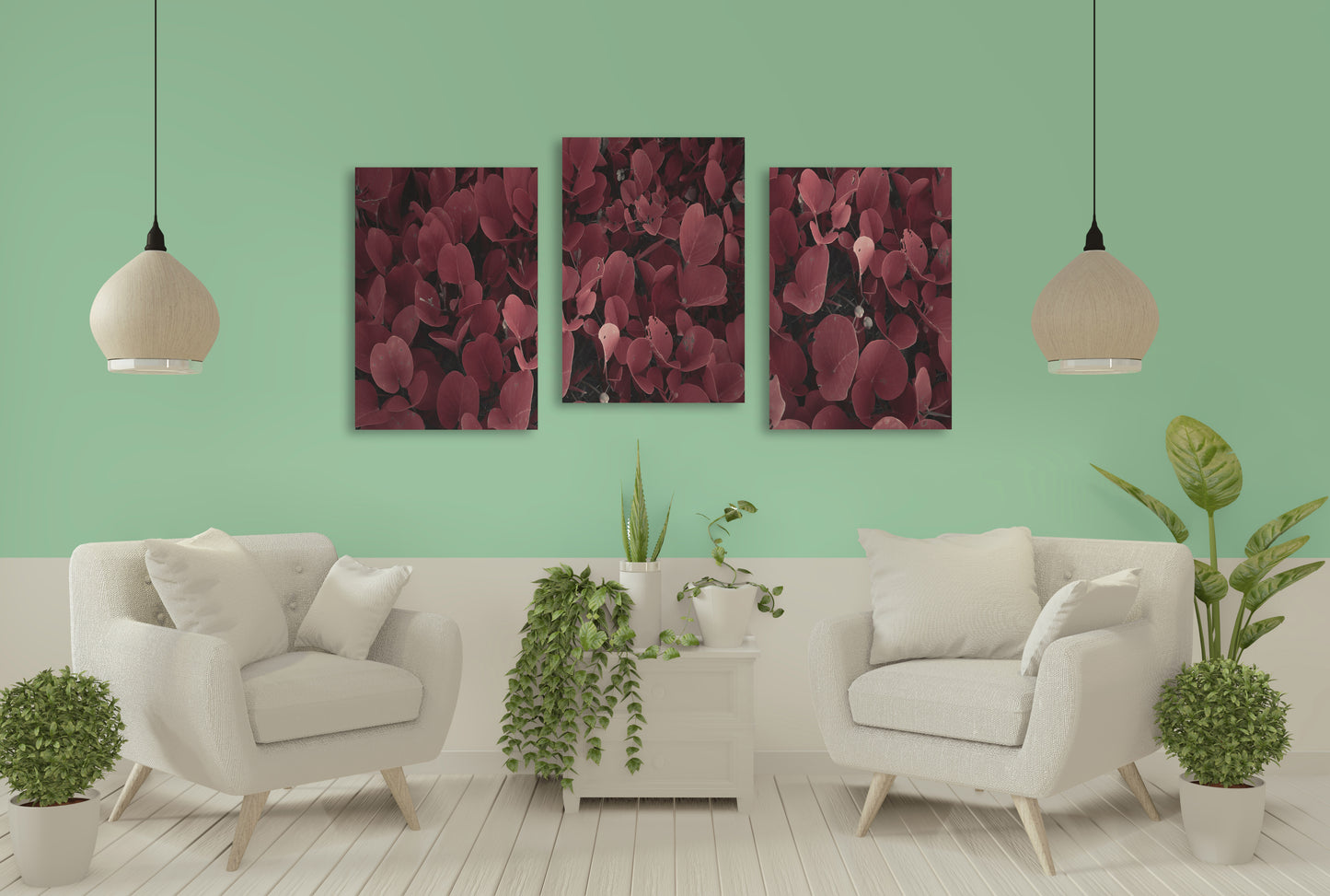 •Die Größe eines Gemäldesets, das aus mehreren Tafeln besteht, wird berechnet, indem die Tafeln addiert werden. Es wird empfohlen, solche Sets mit einem Abstand von 1–2 Zoll zwischen den Paneelen an der Wand anzubringen. Je größer die Bildelemente sind, desto größer ist der zulässige Abstand zwischen ihnen.