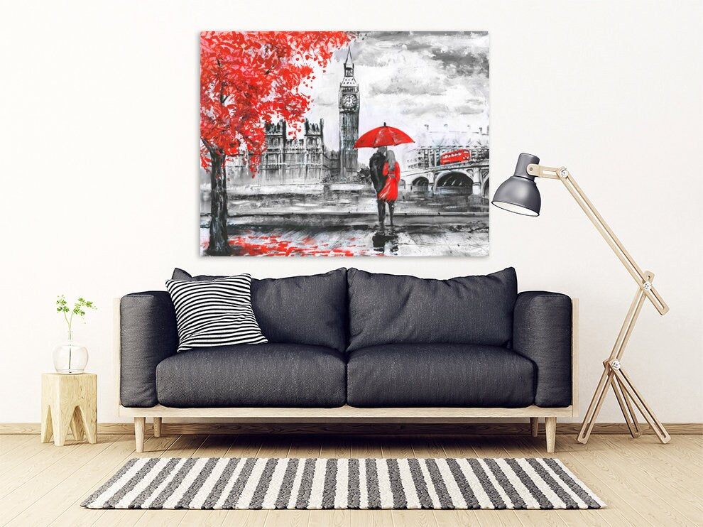Liebesgemälde auf Leinwand, Valentinstagsgeschenk, Liebesbild, rote Regenschirmkunst, rote Baumwanddekoration, verliebtes Paar, extra große Wandkunst