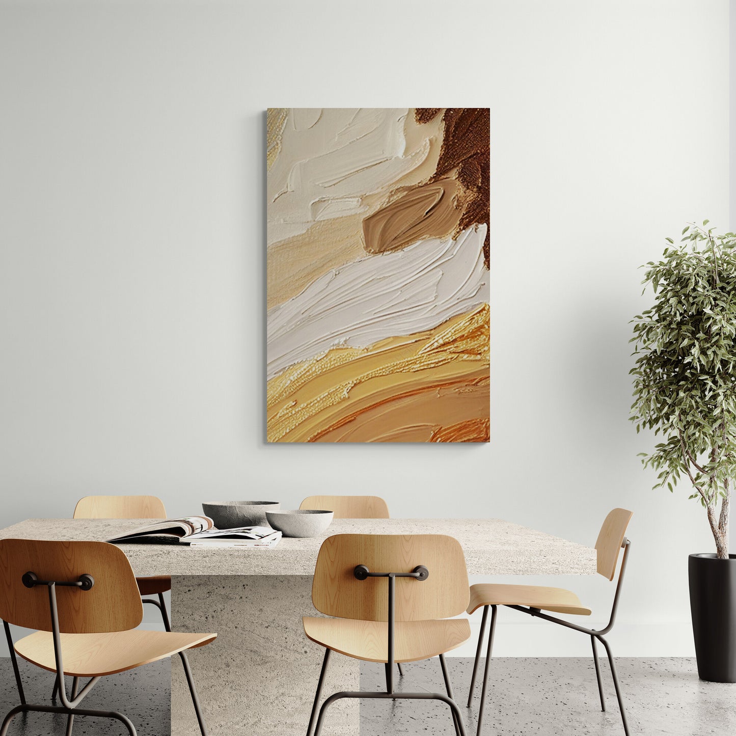 Dieses abstrakte Wandbild mit Ölgemälde-Effekt, ein gerahmter 3D-Effekt-Leinwanddruck in Beige, Orange und Braun, ein Wandbild mit Goldrahmen, ein Geschenk für ihn, trägt maßgeblich zur Atmosphäre und dem Charakter Ihres Interieurs bei. Bilder verleihen jedem Raum Schönheit, Tiefe und Persönlichkeit. Der Druck kann zum zentralen Akzent im Raum werden, der die Blicke auf sich zieht und das Interesse der Besucher weckt.