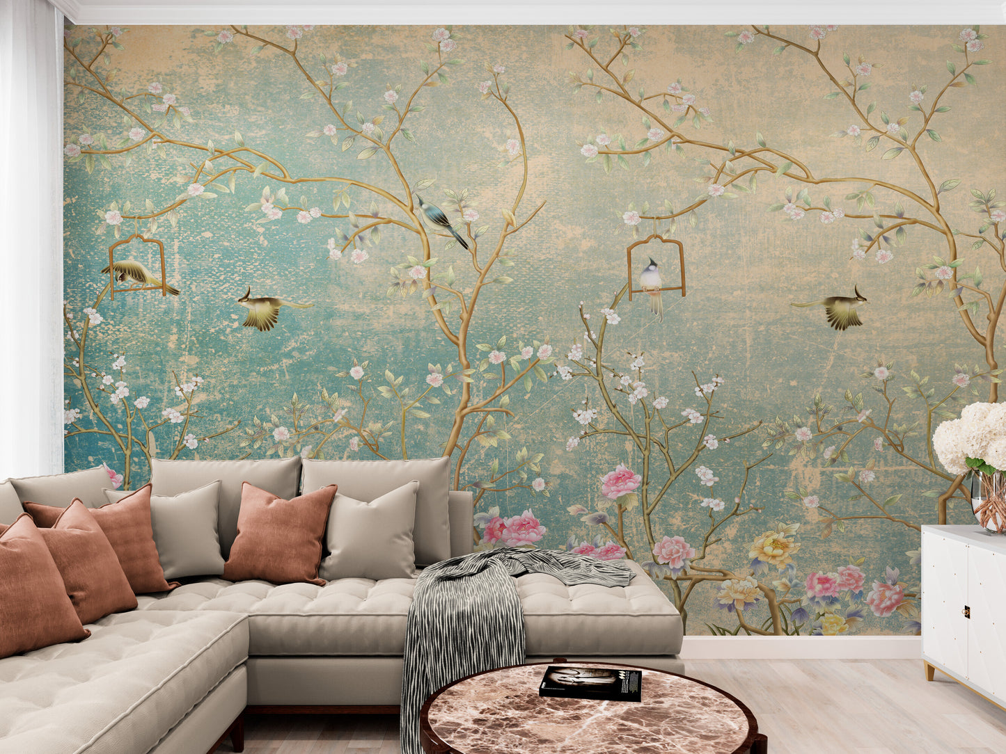 Chinoiserie-Tapete, große Tapete mit Vögeln und Bäumen, asiatisches botanisches Wandbild, abnehmbare Akzenttapete, selbstklebende Tapete, abziehbares und aufklebbares Wandbild aus Leinwand
