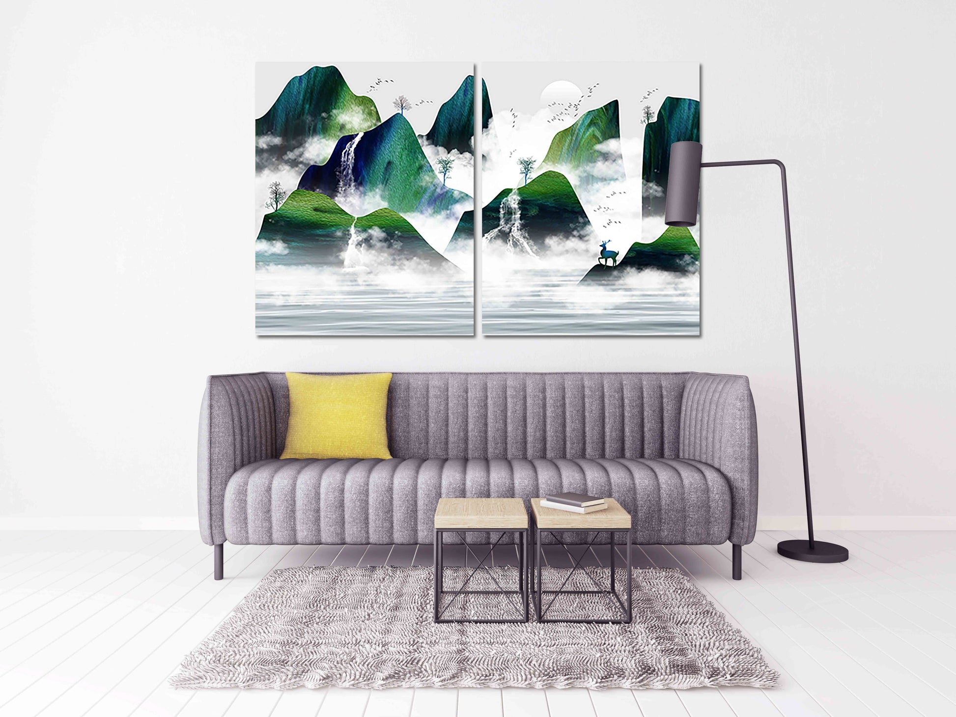 •Die Größe eines Gemäldesets, das aus mehreren Tafeln besteht, wird berechnet, indem die Tafeln addiert werden. Es wird empfohlen, solche Sets mit einem Abstand von 2,5–5 cm zwischen den Paneelen an der Wand zu platzieren. Je größer die Bildelemente, desto größer ist der zulässige Abstand zwischen ihnen.