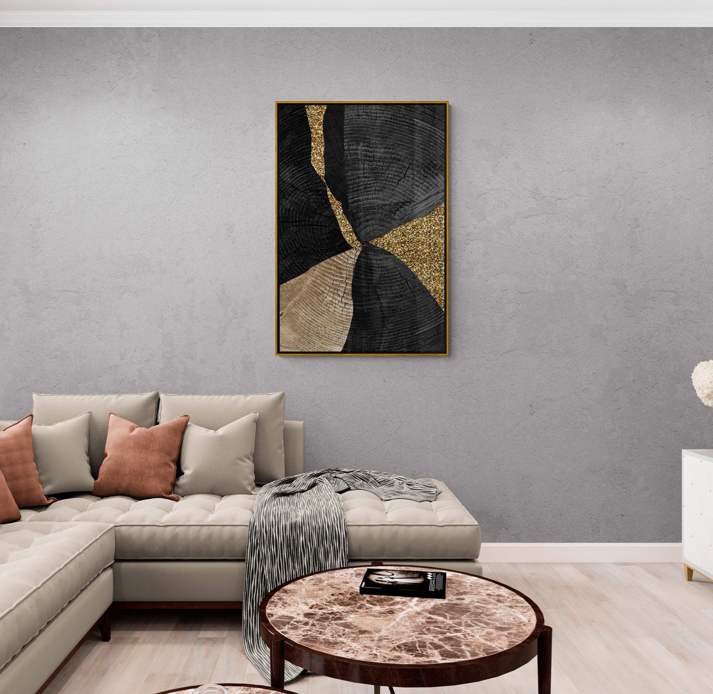 Diese abstrakte Wandkunst, der schwarz-goldene Kunstdruck, der geometrische Leinwanddruck, das moderne gerahmte Kunstwerk, die zeitgenössische Wandkunst, das Geschenk für ihn oder die Bürowandkunst tragen maßgeblich zur Atmosphäre und dem Charakter Ihres Interieurs bei. Bilder verleihen jedem Raum Schönheit, Tiefe und Persönlichkeit. Gedruckte Bilder können zum zentralen Akzent im Raum werden, der die Blicke auf sich zieht und das Interesse der Besucher weckt.